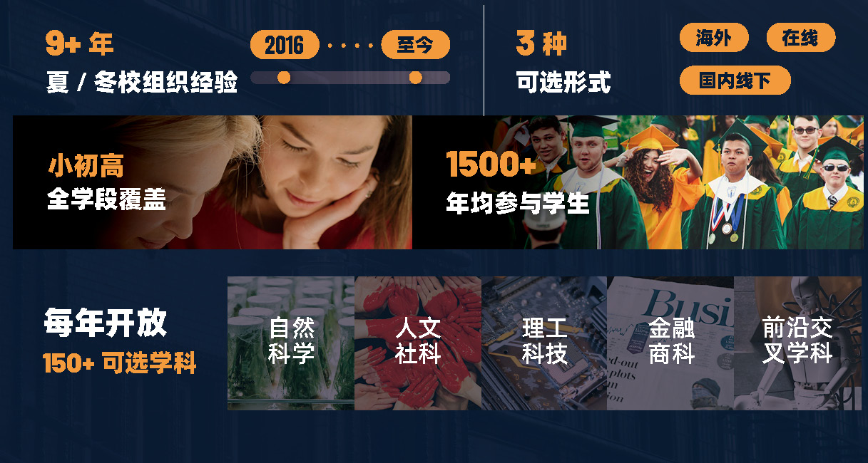 阿思丹世界名校夏校/冬校项目围绕大学专业方向的学术能力提升,以全球Top50知名院校教育场景下的PBL项目为形式,与牛津大学、剑桥大学、帝国理工学院、康奈尔大学、加州大学洛杉矶分校、加州大学伯克利分校、美国西北大学CTD天才营、普渡大学GER²I天才营、新加坡国立大学、新加坡南洋理工大学等世界名校及名校背书学术项目战略合作,为中国优秀小初高学子提供涵盖物理工程、数学计算机、金融经济、生物化学、医学、人文艺术等诸多领域、不同形式(在线/国内线下/海外线下)的学术课程,适应不同阶段学生的发展需求与学术水平。